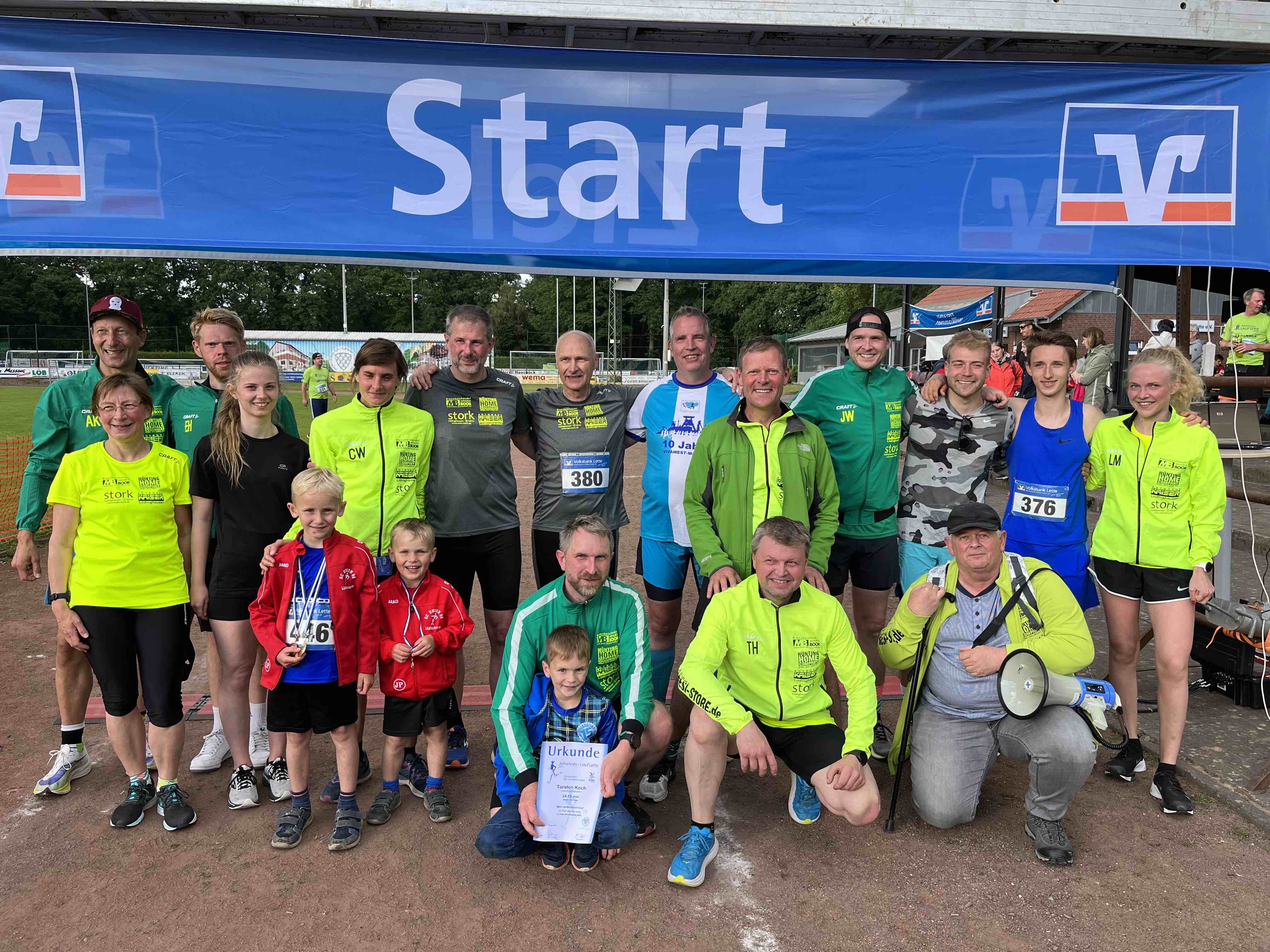 Am Samstag, den 28.05.2022, fand der 2. Lauf der Westmünsterland-Laufserie 2022 in Coesfeld-Lette bei bestem Läuferwetter statt. Am Letter Leichtathletikstadion fanden sich über 230 aktive Läufer und Läuferinnen und etliche Zuschauer*innen, Anfeuerer und ehrenamtliche Helfer*innen zusammen, um einen reibungslosen Wettkampftag durchzuführen. Die Veranstaltung an diesem Tag umfasste einen 400m Bambinilauf, einen 1.5 km Schülerlauf, einen 5 km Jedermannlauf und den 10 km Hauptlauf als Königsdisziplin. Die Veranstaltung war insgesamt sehr läufer-familiär und überschaubar, was keinesfalls negativ zu bewerten ist! Die Organisation und das Flair vor Ort war ideal. In diesem Jahr wurde erstmal die Strecke aufgrund von Bauarbeiten angepasst und erstreckte sich auf einen völlig neunen Rundkurs durch die umliegenden Felder und Wälder Lette’s. Der neuer Rundkurs erstreckte sich beim 5km Lauf über eine Runde mit ~3km und einer kleinen 2km Runde. Der 10km Lauf ging über 3 Runden ~3km und einem Restkilometer in und ums Letter Leichtathletikstadion. Eine sehr schöne Alternativstrecke mit diversen Untergründen – von Asphalt und Schotter bis hin zu sandigen Passagen. Über 15 aktive Läuferinnen und Läufer vom Lauftreff Lüdinghausen waren an diesem Tag über die Distanzen am Start. Beim Bambinilauf nahmen die beiden Söhne von Christine Westerburg teil und eröffneten das Lauffeuerwerk. Doppelt gelaufen an diesem Tag, sprich die 5km und 10km Distanz in Angriff genommen, haben Sascha Köcher und Torsten Koch. Sascha finishte die 5km in 26:17 min und die 10km in 58:18 min in der Rolle des Zugepferdes für Babara Keuthage. Torsten Koch rannte die 5km in 24:15 min und die anschließenden 10km in 53:01 min. Zur Königsdiziplin der 10km startete das größte Läuferfeld an diesem Tag – auch 14 Starterinnen und Starter vom Lauftreff Lüdinghausen. Als erster Lauftreffler beendete Linus Nibbenhagen, als gesamter 3. Platz von 114 Starter*innen das Rennen in 36:44 min – persönliche Bestzeit. Dicht gefolgt von den beiden, zeitgleich das Ziel erreichenden, Athleten Micha Blome und Andreas Koch in 38:28 min. Persönliche Bestzeit für Micha, der sein Ziel unter 40:00 min zu laufen, weit übertreffen konnte. Als erste Frau des Lauftreff’s LH und zweite Frau in der Gesamtwertung lief Lena Markfort mit einer super starken Zeit von 42:45 min ins Ziel im Letter Stadion. Sie wurde dicht gefolgt von Magnus Nibbenhagen, der in 44:01 min die drei windanfälligen Runden erfolgreich absolvierte und glücklich das Ziel erreichte. Etienne Hollweg, der in 44:58 die 10km rannte, konnte ebenfalls eine persönliche Bestzeit aufstellen! Er brachte einen selbstgebackenden Kuchen mit zur Veranstaltung, welchen er im Ziel verteilte! Vielen Dank dafür! Nur ein paar wenige keuchende Luftholter später erreichte Thomas Holtmann die Ziellinie nach 45:37 min und wenige Sekunden darauf Julian Wienhölter nach 45:57 min. Familie Stobbe, bestehend aus Papa Matthias Stobbe und Tochter Elena Stobbe startete an diesem Tag im Duo. Noch vor 2 Wochen bei ViVa West Halbmarathon hatte Tochter Elena ihren Papa abgezogen. Das ließ Matthias an diesem Tag nicht erneut zu. Er finishte nach schnellen 49:51 min, war super zufrieden und ließ Elena mit einer Zielzeit von 51:33 min hinter sich. Christine Westerburg lief ebenfalls eine super Zeit von 50:15 min. Martin Focks erreicht nach 51:27 min die Ziellinie und sicherte sich eine persönliche Bestzeit! Ebenfalls lief Babara Keuthage eine persönliche Bestzeit und joggte erstmals unter der magischen Grenze von 1 Std. und komplettierte das Läuferfeld aus Lüdinghausen. Im Ziel gab es das obligatorische Gruppenfoto, ein Kaltgetränk inkl. der Bratwurst. Die Siegerehrung war voll von Ehrungen des Lauftreff Lüdinghausens. Es sind viele schöne Erinnerungsfotos entstanden. Insgesamt bekommt die Veranstaltung in Lette einen dicken Daumen nach Oben. Nächste Veranstaltung der WML-Laufserie ist der Roruper Abendlauf am 08.07.2022.