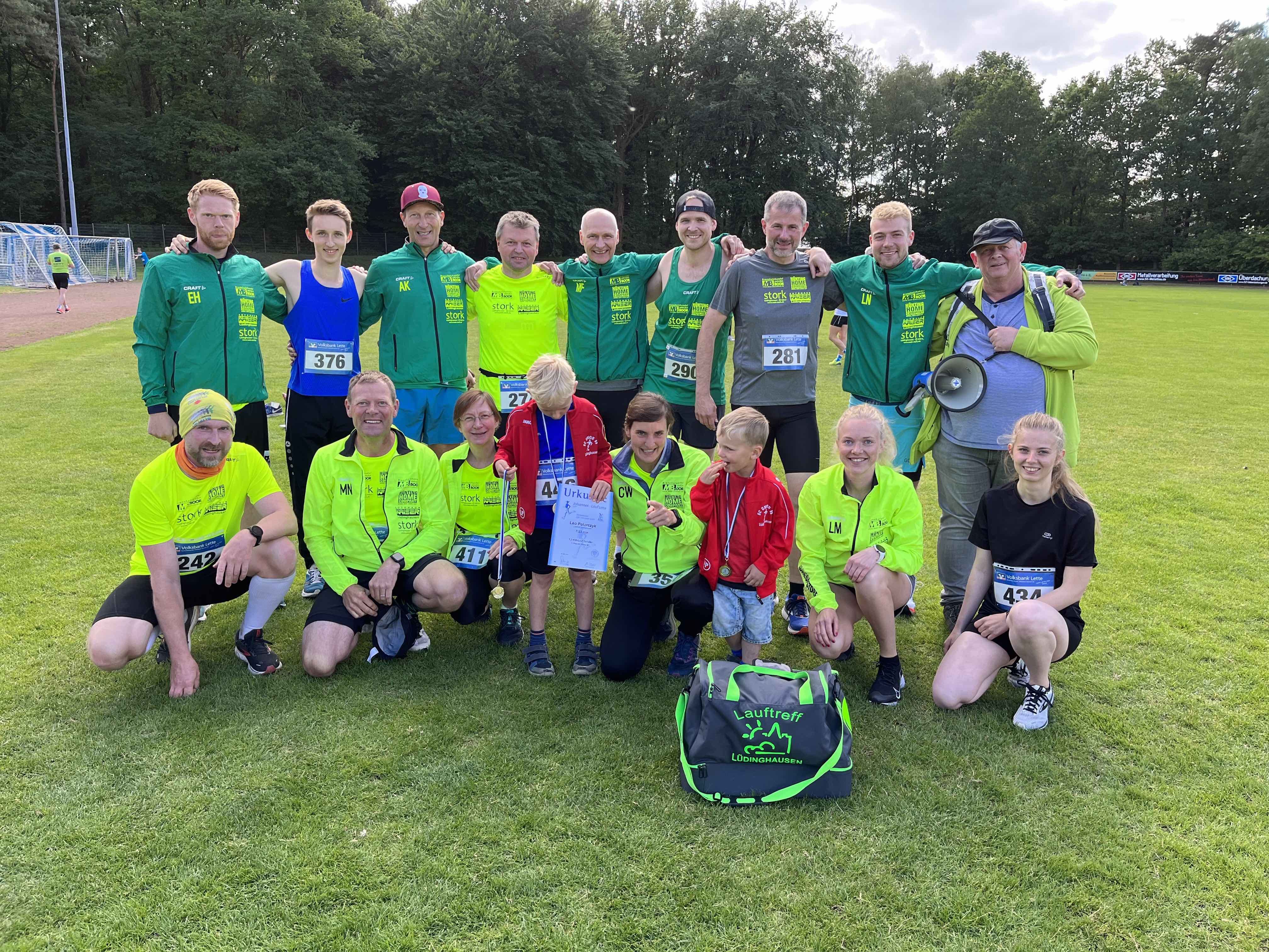 Am Samstag, den 28.05.2022, fand der 2. Lauf der Westmünsterland-Laufserie 2022 in Coesfeld-Lette bei bestem Läuferwetter statt. Am Letter Leichtathletikstadion fanden sich über 230 aktive Läufer und Läuferinnen und etliche Zuschauer*innen, Anfeuerer und ehrenamtliche Helfer*innen zusammen, um einen reibungslosen Wettkampftag durchzuführen. Die Veranstaltung an diesem Tag umfasste einen 400m Bambinilauf, einen 1.5 km Schülerlauf, einen 5 km Jedermannlauf und den 10 km Hauptlauf als Königsdisziplin. Die Veranstaltung war insgesamt sehr läufer-familiär und überschaubar, was keinesfalls negativ zu bewerten ist! Die Organisation und das Flair vor Ort war ideal. In diesem Jahr wurde erstmal die Strecke aufgrund von Bauarbeiten angepasst und erstreckte sich auf einen völlig neunen Rundkurs durch die umliegenden Felder und Wälder Lette’s. Der neuer Rundkurs erstreckte sich beim 5km Lauf über eine Runde mit ~3km und einer kleinen 2km Runde. Der 10km Lauf ging über 3 Runden ~3km und einem Restkilometer in und ums Letter Leichtathletikstadion. Eine sehr schöne Alternativstrecke mit diversen Untergründen – von Asphalt und Schotter bis hin zu sandigen Passagen. Über 15 aktive Läuferinnen und Läufer vom Lauftreff Lüdinghausen waren an diesem Tag über die Distanzen am Start. Beim Bambinilauf nahmen die beiden Söhne von Christine Westerburg teil und eröffneten das Lauffeuerwerk. Doppelt gelaufen an diesem Tag, sprich die 5km und 10km Distanz in Angriff genommen, haben Sascha Köcher und Torsten Koch. Sascha finishte die 5km in 26:17 min und die 10km in 58:18 min in der Rolle des Zugepferdes für Babara Keuthage. Torsten Koch rannte die 5km in 24:15 min und die anschließenden 10km in 53:01 min. Zur Königsdiziplin der 10km startete das größte Läuferfeld an diesem Tag – auch 14 Starterinnen und Starter vom Lauftreff Lüdinghausen. Als erster Lauftreffler beendete Linus Nibbenhagen, als gesamter 3. Platz von 114 Starter*innen das Rennen in 36:44 min – persönliche Bestzeit. Dicht gefolgt von den beiden, zeitgleich das Ziel erreichenden, Athleten Micha Blome und Andreas Koch in 38:28 min. Persönliche Bestzeit für Micha, der sein Ziel unter 40:00 min zu laufen, weit übertreffen konnte. Als erste Frau des Lauftreff’s LH und zweite Frau in der Gesamtwertung lief Lena Markfort mit einer super starken Zeit von 42:45 min ins Ziel im Letter Stadion. Sie wurde dicht gefolgt von Magnus Nibbenhagen, der in 44:01 min die drei windanfälligen Runden erfolgreich absolvierte und glücklich das Ziel erreichte. Etienne Hollweg, der in 44:58 die 10km rannte, konnte ebenfalls eine persönliche Bestzeit aufstellen! Er brachte einen selbstgebackenden Kuchen mit zur Veranstaltung, welchen er im Ziel verteilte! Vielen Dank dafür! Nur ein paar wenige keuchende Luftholter später erreichte Thomas Holtmann die Ziellinie nach 45:37 min und wenige Sekunden darauf Julian Wienhölter nach 45:57 min. Familie Stobbe, bestehend aus Papa Matthias Stobbe und Tochter Elena Stobbe startete an diesem Tag im Duo. Noch vor 2 Wochen bei ViVa West Halbmarathon hatte Tochter Elena ihren Papa abgezogen. Das ließ Matthias an diesem Tag nicht erneut zu. Er finishte nach schnellen 49:51 min, war super zufrieden und ließ Elena mit einer Zielzeit von 51:33 min hinter sich. Christine Westerburg lief ebenfalls eine super Zeit von 50:15 min. Martin Focks erreicht nach 51:27 min die Ziellinie und sicherte sich eine persönliche Bestzeit! Ebenfalls lief Babara Keuthage eine persönliche Bestzeit und joggte erstmals unter der magischen Grenze von 1 Std. und komplettierte das Läuferfeld aus Lüdinghausen. Im Ziel gab es das obligatorische Gruppenfoto, ein Kaltgetränk inkl. der Bratwurst. Die Siegerehrung war voll von Ehrungen des Lauftreff Lüdinghausens. Es sind viele schöne Erinnerungsfotos entstanden. Insgesamt bekommt die Veranstaltung in Lette einen dicken Daumen nach Oben. Nächste Veranstaltung der WML-Laufserie ist der Roruper Abendlauf am 08.07.2022.